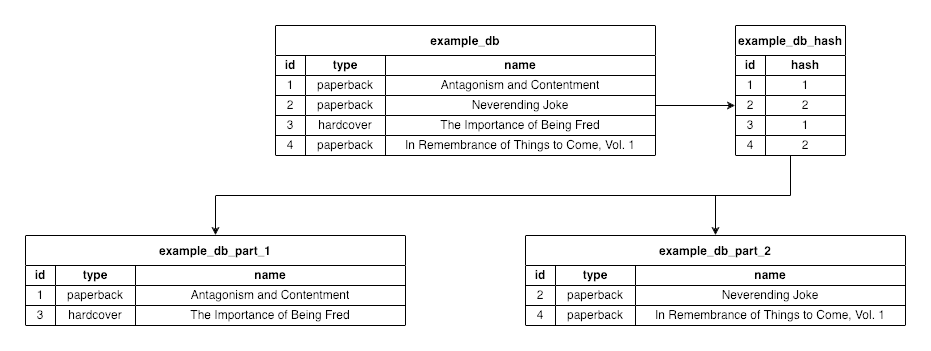 Here, the initial database (example_db) gets partitioned into two databases (example_db_part_1 and example_db_part_2). Each partition, or “shard”, gets some rows from the initial database.
